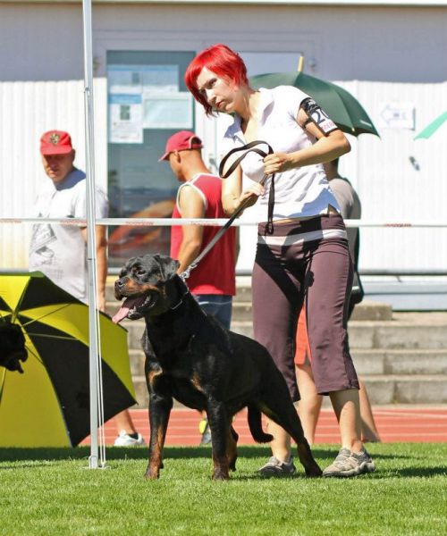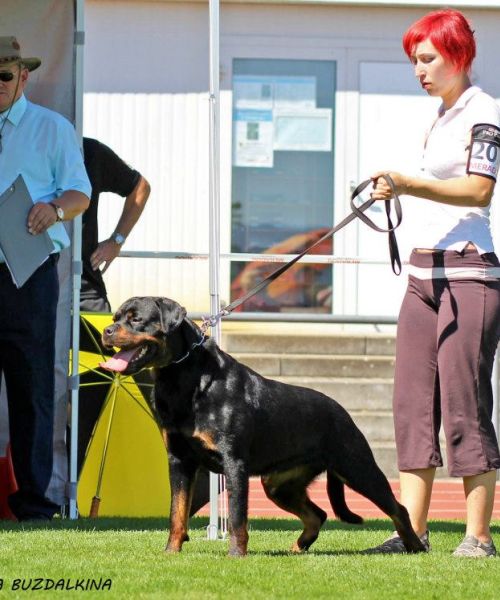 groß, umgänglich , aufmerksam, sehr gute Knochenstärke, harmonisch und typvoll in der Erscheinung, sehr guter Kopftyp, mittelgroße, korrekt getragenen Ohren, 1a Auge, kurzer, kräftiger, vitaler Fang mit hervorragenden dunklen Maulpigmenten, Lefzen sollten etwas straffer anliegen, sehr gut bemuskelter Hals, Vor-und Hinterhand sehr gut gestellt und gewinkelt, Brust in natürlicher Breite und Tiefe, Pfoten etwas weich gestellt, nicht ganz geschlossen, gut bemuskelte Keulen, gut bemuskelter Rücken mit leicht abfallender Kruppe und hängend getragener Rute, natürliche Ganganlagen mit etwas fehlendem Schub aus der Hinterhand, rotbrauner Brand, korrektes, gepflegtes Stockhaar