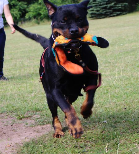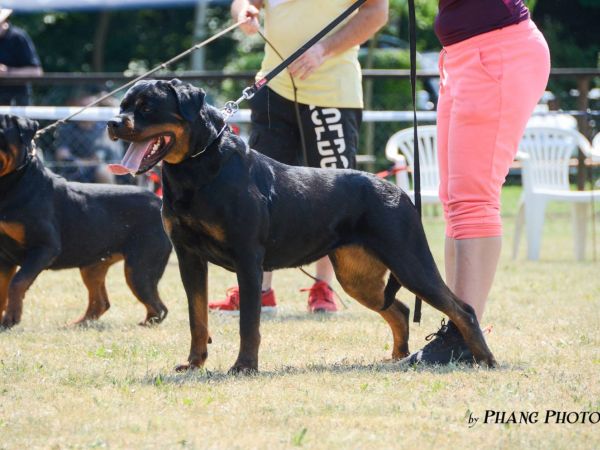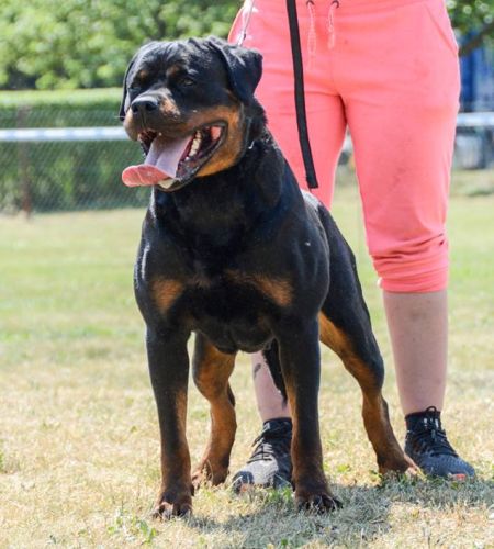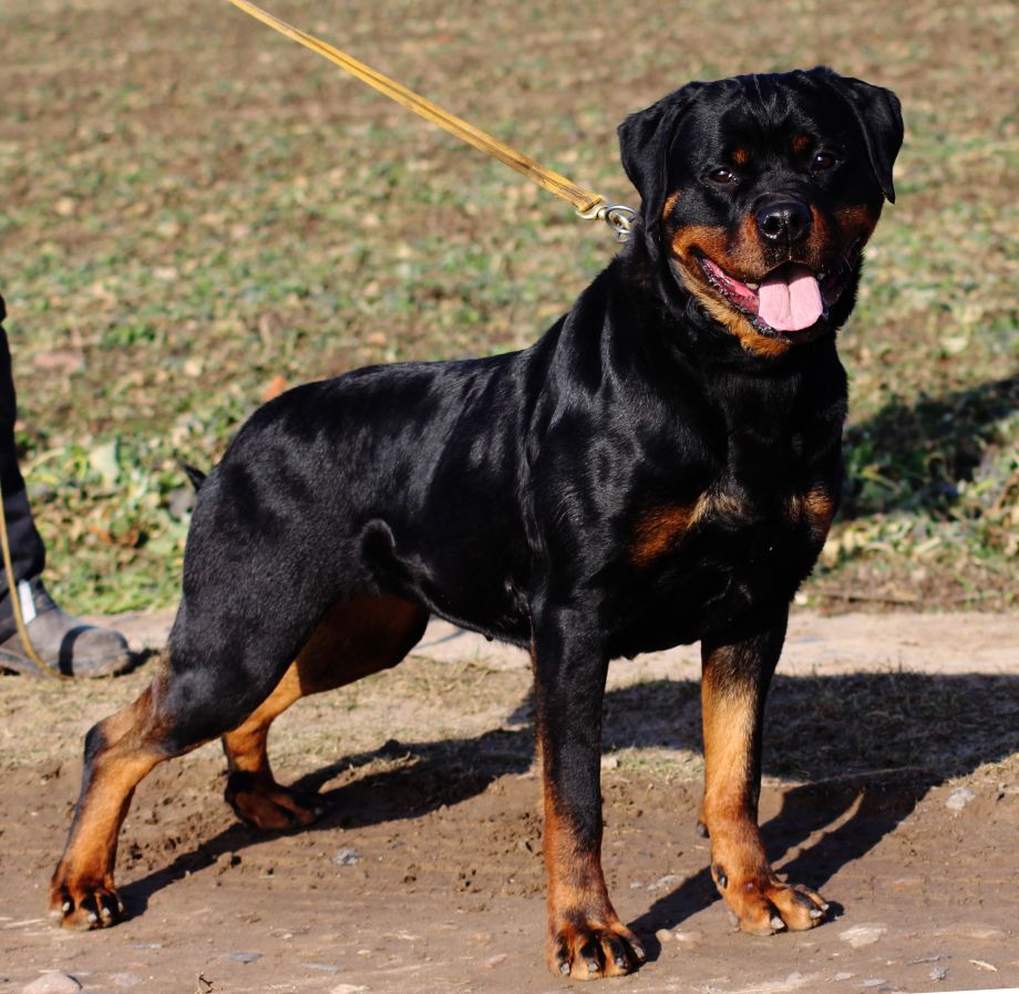 mittelgroß, knochenstark, etwas gestreckt, sehr gute Substanz, schöner kräftiger Hündinnenkopf, mittelgroße Ohren, korrekt getragen, sehr guter Stop, tiefbraune Augen, kräftiger Fang, Maulpigmente dunkel, Lefzen leicht rosa, kräftiger, langer, schwanenförmiger Hals, sehr gute Vorbrust, sehr gute Brustbreite und -tiefe, Vordermittelfuß rechts leicht ausdrehend, kräftiger, breiter Rücken, sehr gut gewinkelte Hinterhand, Rute bei Erregung säbelförmig getragen, leichte Kruppenrundung, sehr gut bemuskelte Keule, gesundes Stockhaar, rostbraune Abzeichen, auf den Vorderläufen leicht schwarz, im Nacken leicht grau gesprenkelt, kräftige Sprunggelenke, sehr guter Vortritt mit mittlerem Schub aus der Hinterhand