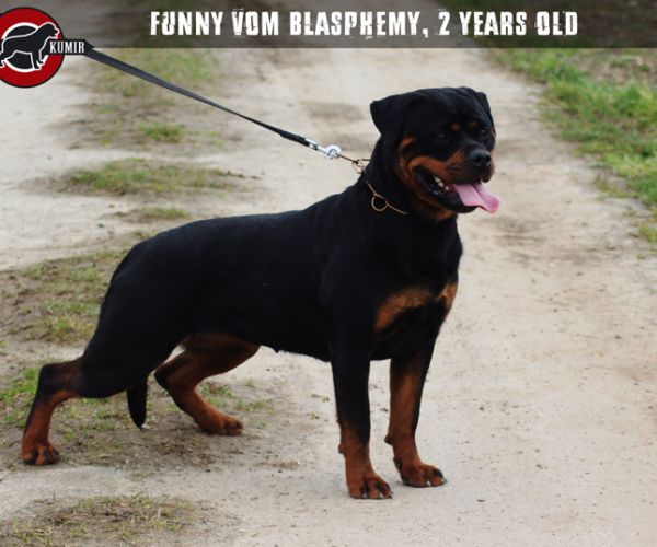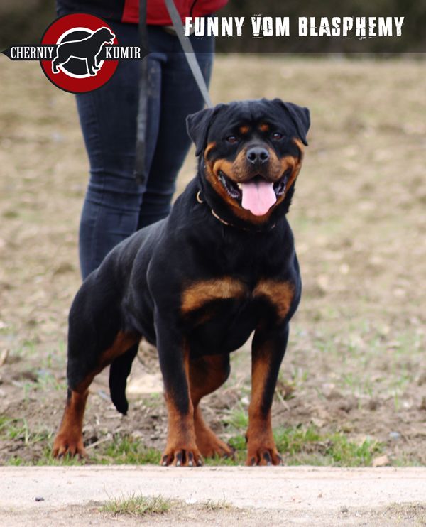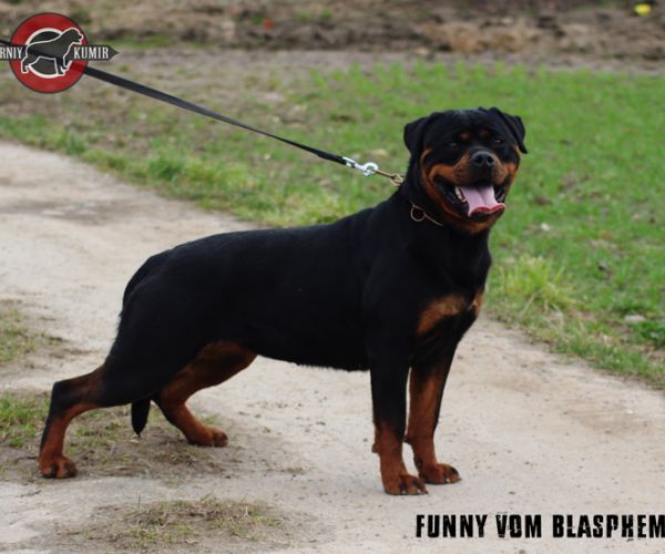 große, kräftige, gut aufgebaute Hündin, umgänglich, kräftiger, etwas gedrungener Kopf, Fang von ausreichender Länge, dunkle Maulpigmente, mittelgroße Ohren, korrekt getragen, unter Aufmerksamkeit leichte Stirnfalten, breite, tiefe Brust, gute Schulterfestigkeit, gerade Vorhand, kleine, feste Pfoten, sehr gute Nackenrückenlinie, gut ausgefüllte Lendenpartie, kräftiger Rutenansatz, Rute hängend getragen, volle Keulen, sehr gute Winkelungen, gesundes Stockhaar, rostbraune Abzeichen, an der Brust leicht dunkel durchsetzt, sehr gute Ganganlagen, baut sich in der Bewegung etwas auf, Rücken leicht nachgebend